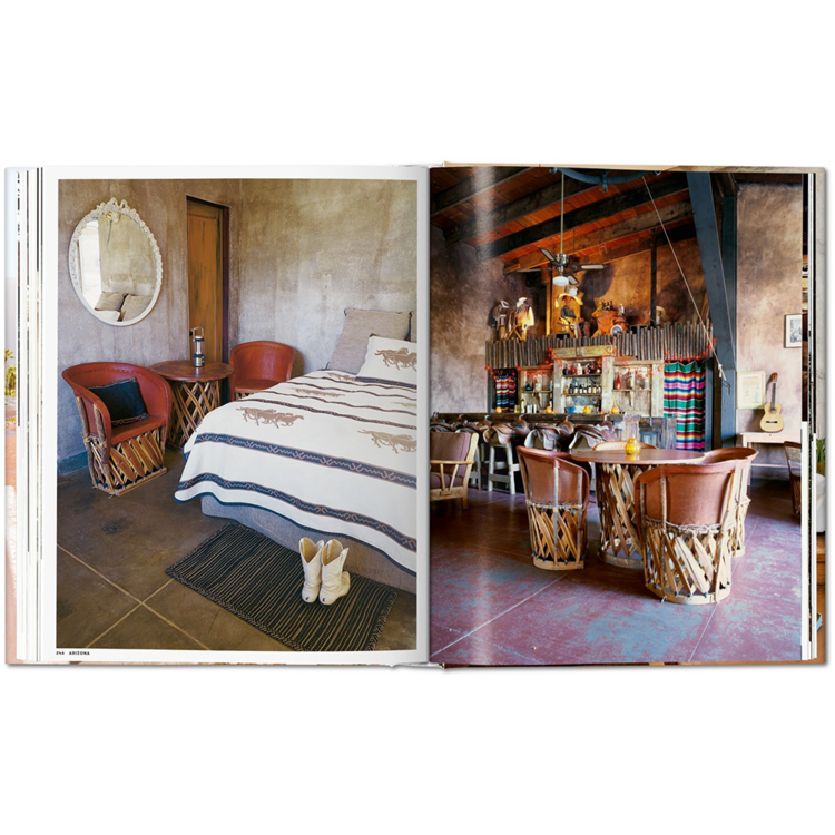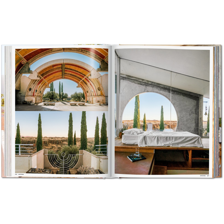 이 풍부한 출판물의 사진은 프랭크 로이드 라이트 같은 위대한 건축가의 전통과 전형적인 미국 중세기 양식의 젊은 현대 디자이너와 건물들의 작품을 보여준다. 말 목장, 글램핑장, 심지어 히피 목욕탕과 빈티지 이동식 주택도 포함되어 있습니다 – 미국 자체만큼이나 다양한 장소입니다!