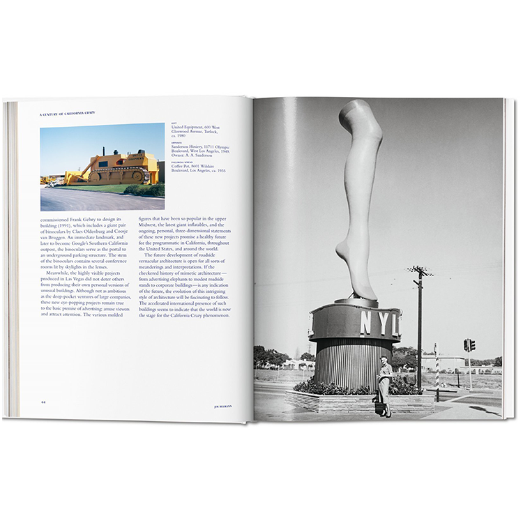 그러나, 그들은 특히 미국의 선벨트를 따라 번창했고, 특히 남부 캘리포니아에서는 소유주들이 부엉이, 인형, 돼지, 배에서 커피 포트와 과일까지 거대하고 괴상한 건축물의 형태로 그들의 창조적 충동을 탐닉했다. 그들의 상징적인 의도는 무모했지만, 그들은 역사에 의해 소외되었다. 하지만, 지난 40년 동안 캘리포니아의 건축 이상 현상들은 그 온전함을 되찾았고, 이제 새롭게 개정된 건물들의 개요인 캘리포니아 크레이지(California Crazy)에서 기념되고 있다.