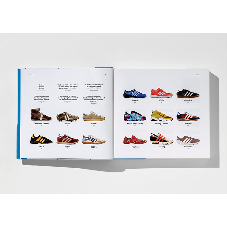 디자이너 자크 차상(Jacques Chassang)의 서문과 전문가 텍스트와 함께 사진마다 그 이유와 방법을 알려주면서도 아디다스의 원동력을 전달한다. 우리가 발견한 것은 단순한 디자인을 넘어선 것이다. 결국, 이 신발들은 그들을 사랑했던 사용자들에 의해 낡아진 신발에 불과하다. 그러나 그들은 또한 다슬러 형제의 시작부터 아디다스의 설립까지, 우리의 스포츠, 디자인, 그리고 문화 역사의 직접적인 목격자이기도 하다.