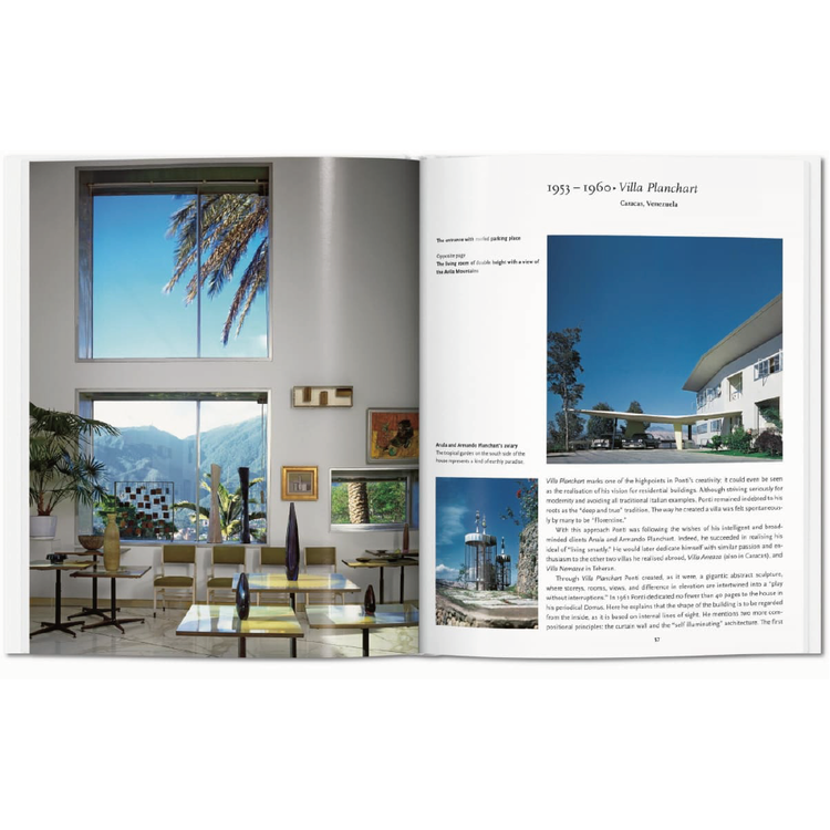 이 집은 폰티의 반복적인 관심사 중 하나이자 혁신의 중심 영역이었다. 내부 공간과 외부 공간을 신중하게 고려한 토탈 디자인에 대한 그의 재능은 이번 판에 등장하는 광택이 나는 복제품, 평면도 및 도면에 도표화되어 있습니다. 폰티의 화려하고, 편안하고, 우아한 공간들은 표현적인 신고전주의와 떠오르는 모더니즘적인 감성을 혼합했다.