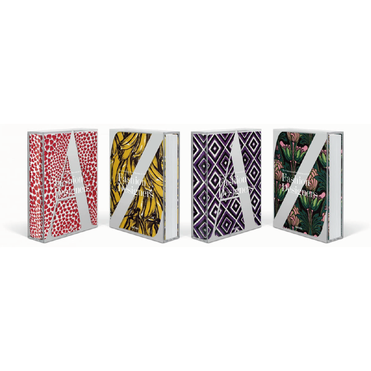 《Fashion Designers A–Z》는 총 11,000부 한정 디자이너 에디션 시리즈로 출시되며, 각 권은 다음 여섯 명의 디자이너가 제작한 패브릭으로 제본되었습니다: