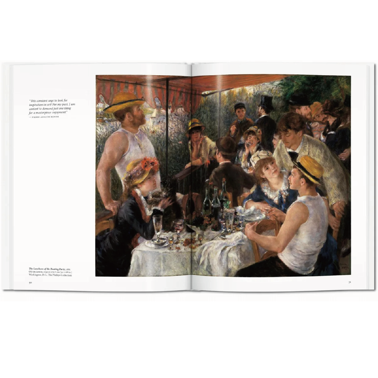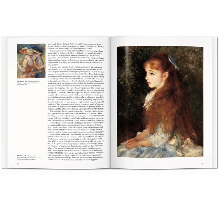 르누아르의 작품은 그의 일생 동안 수천 개의 작품으로 다산을 했습니다. 쿠르베, 드가, 마네, 들라크루아와 같은 선구자들의 영향을 많이 받은 그는 모네와 같은 현대의 동료들과 함께 색과 붓놀림의 새로운 사용법을 탐구하고, 다른 색상의 다브로 질감과 깊이를 표현했습니다. 친밀하고 부드러운 인간적인 장면에 매료되어, 그의 주제는 연인, 어머니, 그리고 수많은 누드를 포함합니다.