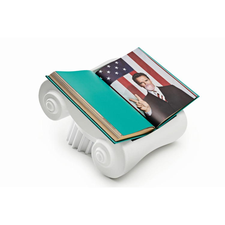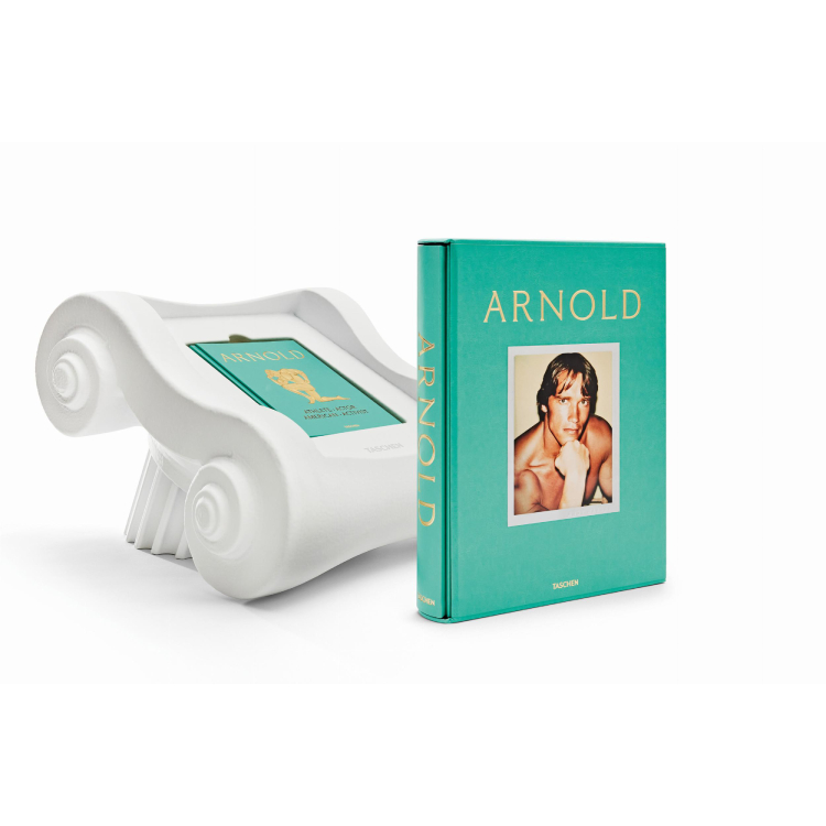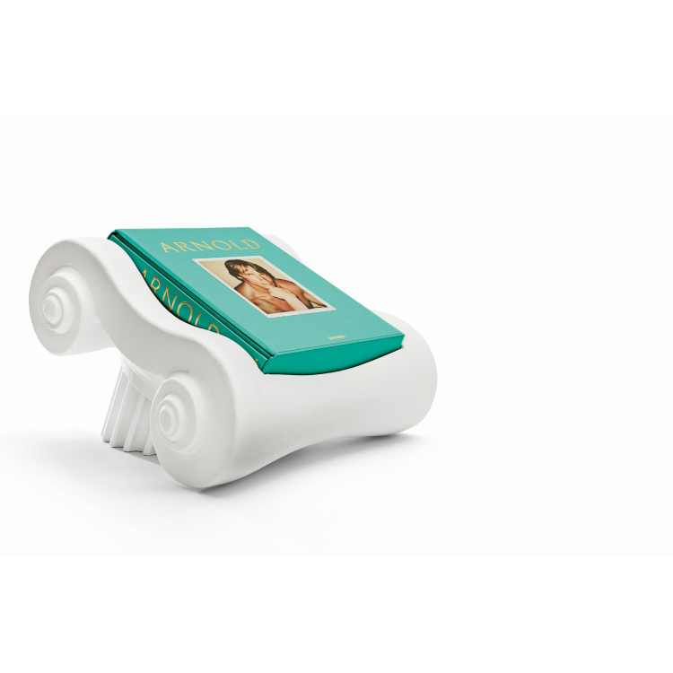 또한 아트 에디션에는 독특한 책 스탠드가 포함되어 있습니다. 이는 Studio65가 1971년에 제작한 상징적인 카피텔로 의자의 1:2 비율 복제품으로, Gufram에서 제작했습니다. 고전 그리스 이오니아식 기둥 머리와 기둥을 팝적으로 변형한 이 디자인은 아놀드의 유명한 체격에 구현된 그리스 이상에 대한 적절한 헌사입니다.
