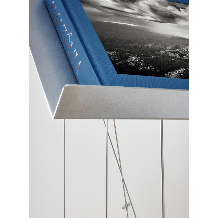책의 서문에서 살가두는 이렇게 씁니다. “저에게 이곳은 마지막 개척지이며, 지구상 그 어느 곳에서도 느낄 수 없는 자연의 거대한 힘을 느낄 수 있는 신비한 우주입니다. 이곳은 무한히 펼쳐진 숲으로, 전 세계 식물과 동물 종의 10분의 1이 서식하는 세계 최대의 자연 실험실입니다.” 자연과의 이러한 연결은 렌조 피아노의 책받침 디자인에도 반영되어 있습니다. 피아노는 책받침에 대해 “책을 공중에 띄우는 가장 간단한 방법입니다. 책받침이 보이지 않고, 공중에 단단히 고정된 책만 보입니다. 펼쳐진 페이지는 마치 날고 있는 알바트로스처럼 보입니다.”라고 설명합니다. 저탄소강에 분체 도장을 하고, 나사형 중앙 막대와 고무 조절 발을 사용하여 제작된 이 독서는 아마조니아 프로젝트를 위해 디자인되었습니다.