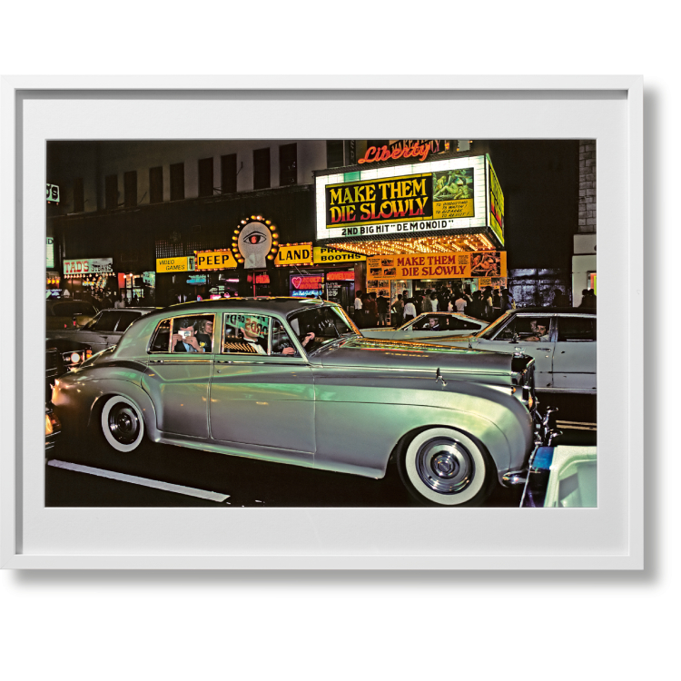이 42번가 사진은 뉴먼이 타임스퀘어 시리즈를 찍은 지 약 30년 후에 촬영되었으며, 그 지역을 위협적이고 음습한 분위기로 재조명하고 있습니다. 이는 몇 년 전에 개봉된 영화 **택시 드라이버(Taxi Driver)**에서 완벽히 묘사된 바 있습니다. 1950년대 이후의 주요한 카메라와 필름 기술의 발전은 뉴먼이 자신의 콘텐츠에 더욱 강렬한 드라마를 불어넣을 수 있게 했습니다. 그는 표지판을 이용해 거리의 무대 같은 설정을 더욱 강조하며, 영화 제목 **Make Them Die Slowly**로 인해 장면에 음산한 아이러니를 부여했습니다. 뉴먼은 롤스로이스를 타고 지나가며 사진작가를 뒷좌석에서 촬영하는 요피 그룹에 의해, 마치 관음자로서 그들의 시선에 포착된 듯한 위치에 서 있습니다.