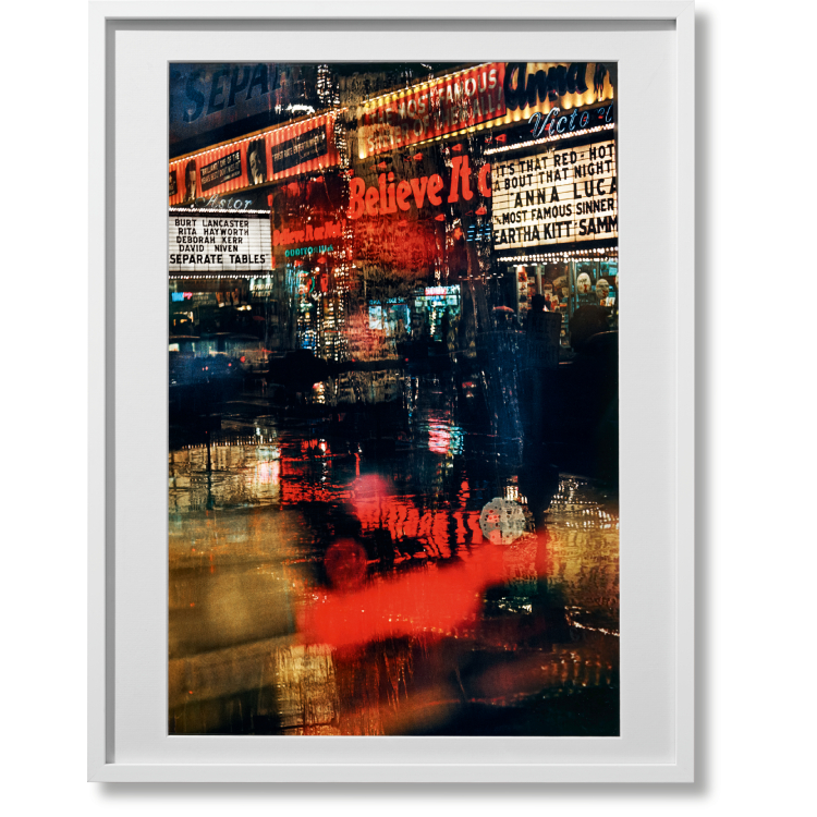 뉴욕 전후의 비공식 본부였던 타임스퀘어와 42번가는 뉴먼의 독특한 도시 풍경을 담기에 완벽한 장소였습니다. 이 이미지는 타임스퀘어를 주제로 한 중요한 컬러 시리즈의 일부로, 모든 스트리트 포토그래피 애호가들의 공감을 불러일으킵니다. 뉴먼은 컬러 필름, 텅스텐 조명, 영화관, 밝게 빛나는 간판, 비가 쏟아지는 거리 등 모든 요소를 활용하여 타임스퀘어를 궁극적인 극장 무대로 변모시켰습니다. 그 결과, 현실과 환상이 뒤섞인 멋진 쇼가 탄생했으며, "믿어야만 하는" 몰입감 있는 시각적 경험을 제공합니다.