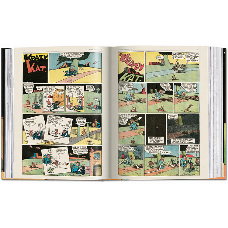 조지 해리먼은 1913년부터 1944년 사망할 때까지 신문 연재 만화 *크레이지 캣(Krazy Kat)*에서 이 공식을 끝없이 변주했습니다. 해리먼은 재치, 섬세한 캐릭터 묘사, 그리고 시각적·언어적 창의성을 통해 만화에 큰 관심이 없던 이들까지 끌어들였습니다. 거트루드 스타인, F. 스콧 피츠제럴드, 파블로 피카소, 제임스 조이스, 우드로 윌슨 대통령, 잭슨 폴락, 찰리 채플린, 프랭크 카프라, P.G. 우드하우스, 빌렘 드 쿠닝 등 수많은 인물들이 크레이지 캣의 팬이었습니다.