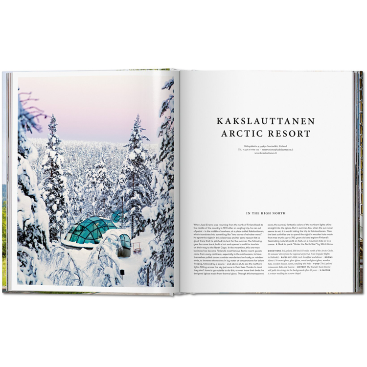 이 개정 및 업데이트 버전은 유럽 대륙 전역에서 가장 독특한 호텔과 분위기 있는 게스트하우스를 선별하여 제공한다. 숨막히는 위치와 인테리어로 선정된 각 안식처는 스타일의 주변 환경과 일상 생활이 녹아내릴 수 있는 고요함을 제공한다. Angelika Taschen은 손님이 저녁 식사를 위해 낚시를 할 수 있는 오스트리아 호수의 목가적인 장소인 Der Seehof와 같은 보석을 공개한다. Pritzker 상을 수상한 Eduardo Souto De Moura가 개조한 150년 된 포르투갈 부동산은 오늘날까지 농장으로 남아 있다. 노르웨이의 Dovrefjell 국립공원 가장자리에 위치한 세계에서 가장 외로운 순례길 중 하나인 Budsjord의 마지막 정류장이다.