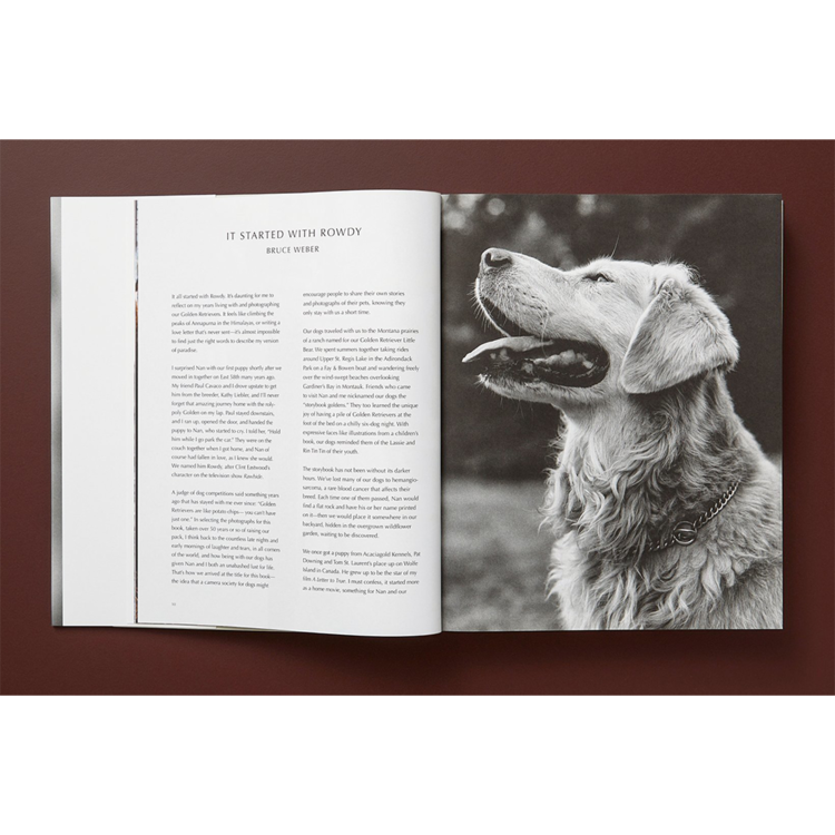 사진작가이자 영화제작자인 Bruce Weber는 예술가, 배우, 운동선수의 휴머니스트 초상화, 감정, 불손, 향수로 가득 찬 패션 확산, 에로티즘에 대한 서정적인 찬사와 미국 풍경의 아카디아적 비전 등 다양한 이미지와 연관되어 있습니다. 이 모든 것들과 골든 리트리버도 마찬가지입니다. 시작부터, 베버는 패션 캠페인, 유명 잡지, 그리고 그의 개인 스크랩북의 페이지들을 위해 그의 사진들을 같은 크기로 채운 자애로운 개 무리들과 함께 여행을 했습니다.
