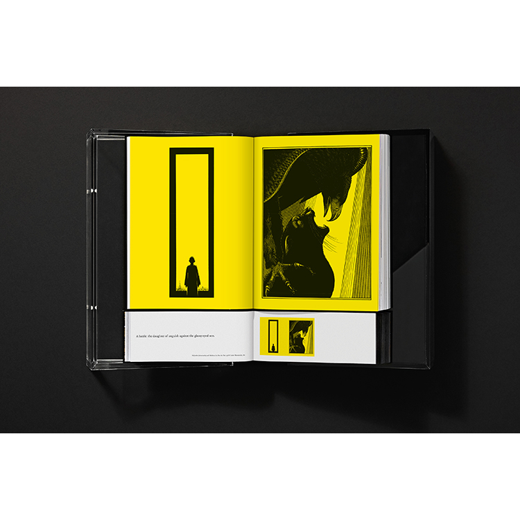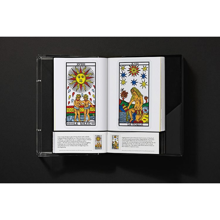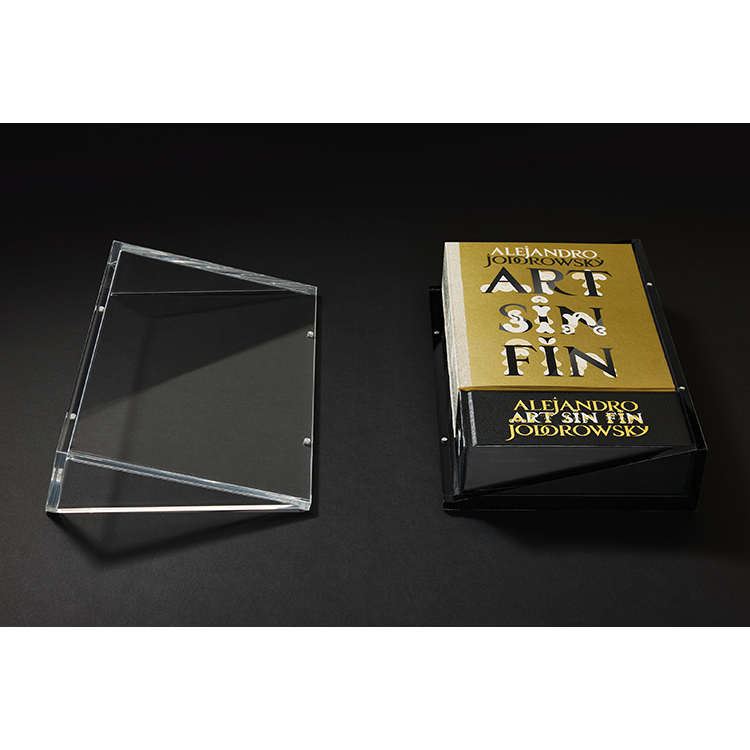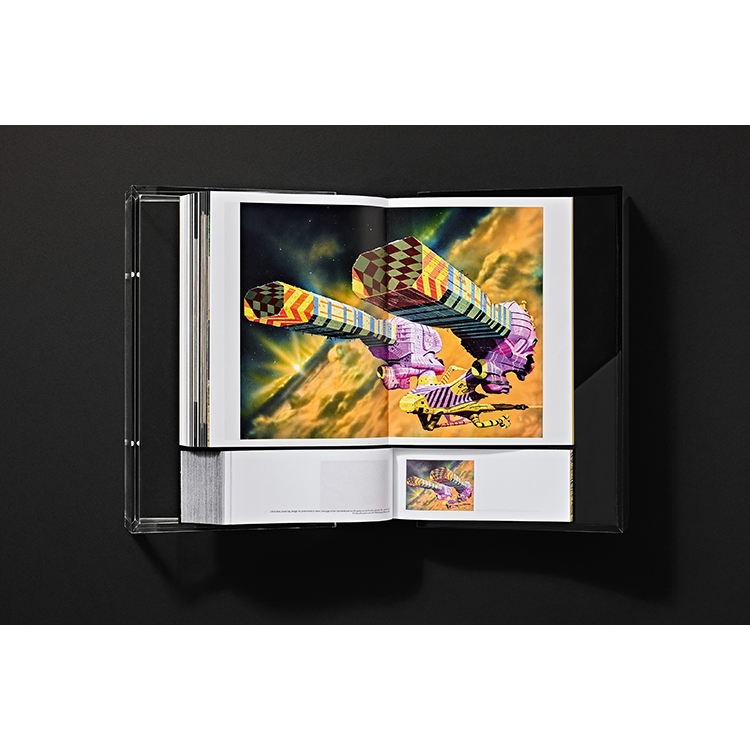 M/M Paris와의 독점 협업으로 디자인된 이 책은 맞춤 제작된 플렉시글라스 박스를 포함하고 있으며, 이는 북 스탠드로도 활용할 수 있습니다. 투명과 다크 플렉시글라스로 이루어진 두 개의 맞물린 피라미드 구조로 제작된 이 조형적 박스 세트는 ‘잉칼 라이트(Incal Light)’와 ‘잉칼 다크(Incal Dark)’처럼 상반된 힘을 상징하는 조도로프스키의 반복적 모티프를 떠올리게 합니다. M/M의 그래픽 해석의 핵심에는 두 가지 맞춤 서체가 있습니다. 하나는 중세 교회 석조 문자에서 영감을 받은 모듈형 재해석(과거의 목소리)이며, 다른 하나는 조도로프스키의 SF 작품에서 영감을 받아 상상 속 미래에서 끌어낸 분자적 알파벳입니다.