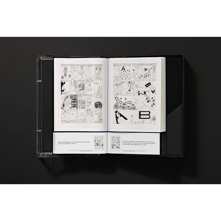 첫 번째 권은 시각적 향연입니다. 작가가 직접 선별하고 구성한 펼침 페이지, 영화 스틸컷, 퍼포먼스 장면, 콜라주, 드로잉, 그리고 아카이브 속 희귀 사진들이 담겨 있습니다. 영화, 연극, 만화, 치유 예술에 이르기까지 그의 작업 전반을 아우르는 방대한 세계를 보여줍니다. 수많은 영화와 수천 페이지에 달하는 만화, 방대한 아카이브에서 하나하나 고른 이미지들은 서로 이어지며 새로운 서사, 즉 감각적인 내러티브를 만들어냅니다.