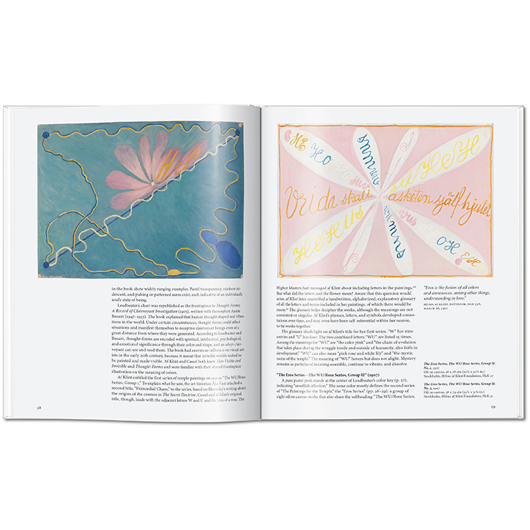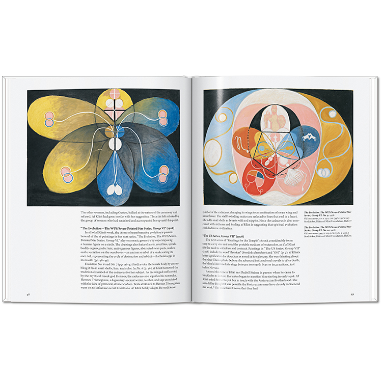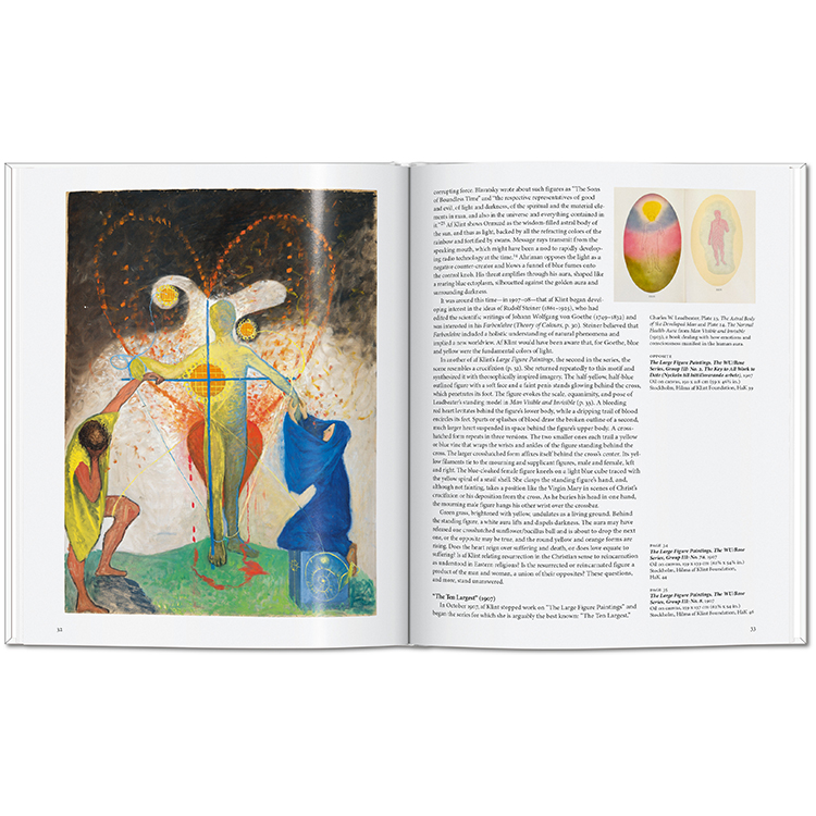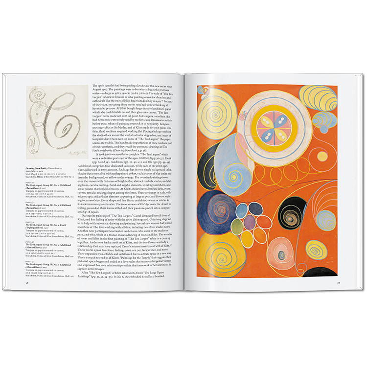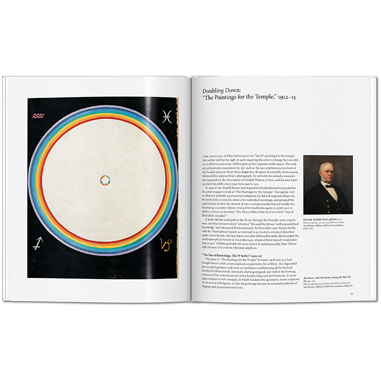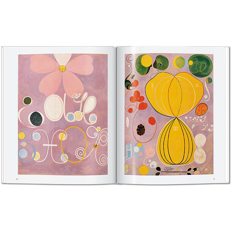 1906년에 이르러 그녀의 캔버스에는 나선과 구(球)가 어우러진 빛나는 기하학적 형상이 등장했고, 상징과 문자, 단어들이 스며들었습니다. 이는 이후 칸딘스키, 말레비치, 몬드리안 등으로 이어질 추상미술의 전개를 앞서 예견하는 것이었습니다. 〈사원을 위한 작업들〉, 〈가장 위대한 열 점(The Ten Largest)〉과 같은 대규모 연작에서는 안과 밖, 세속과 신비, 남성과 여성, 선과 악 등 이중성이 자주 등장합니다.